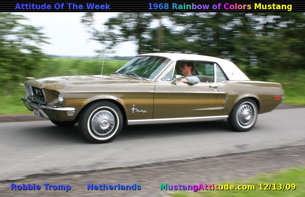 mustang This double unique, special model, Mustang was our featured Attitude of the Week for the week of December 13th, 2009. Robbie Tromp from the Netherlands has restored this Olive Green 1968 Rainbow of Colors promotional Mustang which is also a Branded Special. This olive green is one of 13 special colors which a new Mustang owner could order along with several upgrades in the west coast Rainbow of Colors promotion. Also during this time dealers could add a Branded Special emblem to further promote a car. Amazingly this car is both! This was the first Olive Green Rainbow of Colors promotional Mustang that found us. A few months ago, Wolfgang Kohrn of ponysite.de, contacted us about finding a unique originally painted, olive green, 1968, Mustang in the Netherlands which had all the options and special order data to indicate that it was the first car found of this unique color. This is that car which is also featured on Wolfgang's site. So far we've only found 9 names of the 13 colors of the promotion. This green was not one of them, so we've been temporarily calling it Olive Green. If you know the official color name, let us know. About the same time, Jeff from Oregon, emailed us on his newest purchase of an olive green 1968 Mustang which turns out to be a sister car to Robbie's because the share the same DSO order area, special order number, and therefore ordered by the same dealer which was, Lou Gerard Motors, in Redding, California. Look at the other photos of this car, Robbie has much more information.